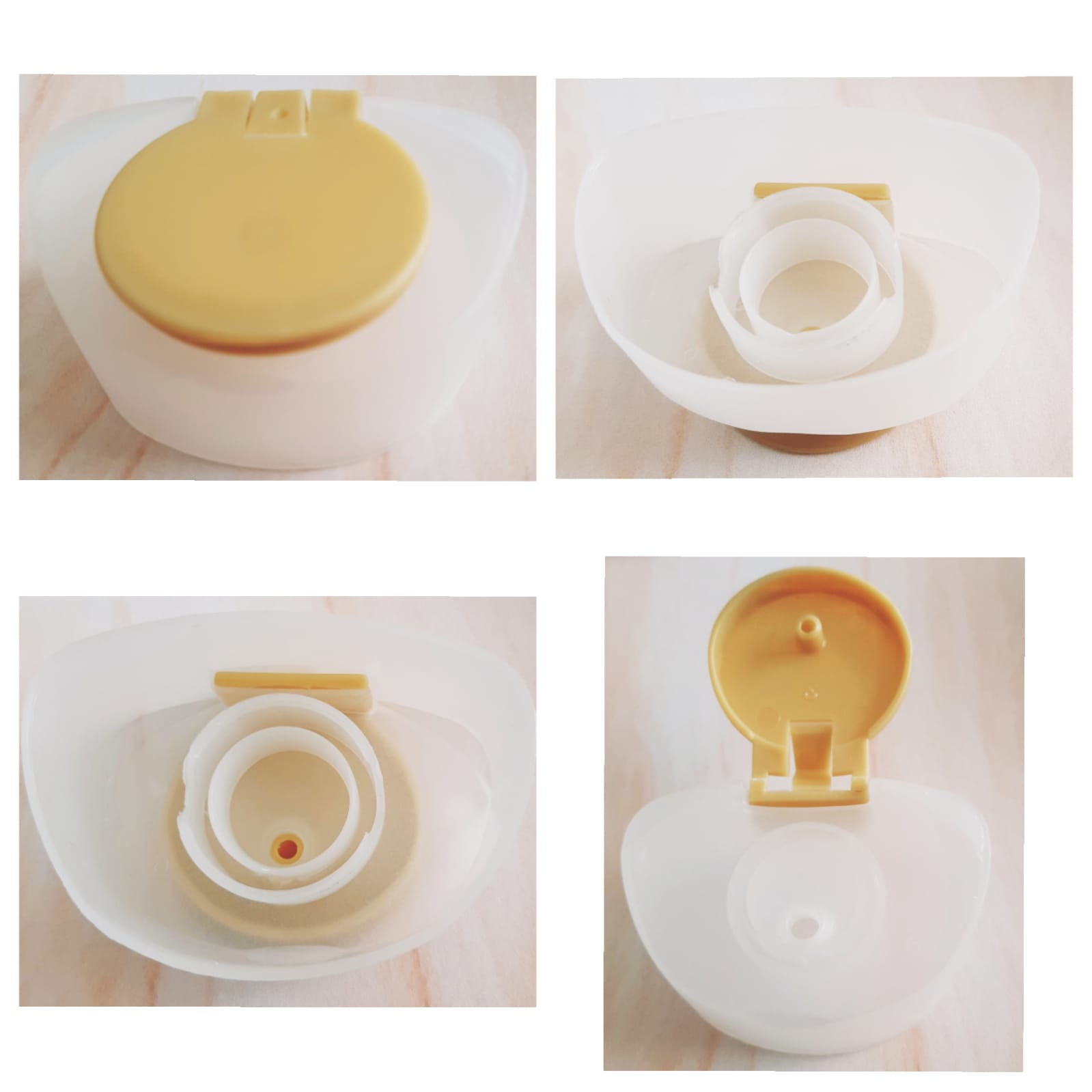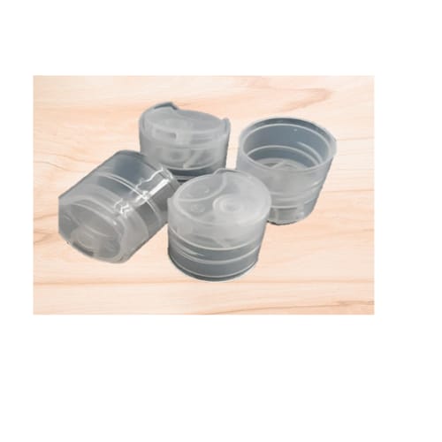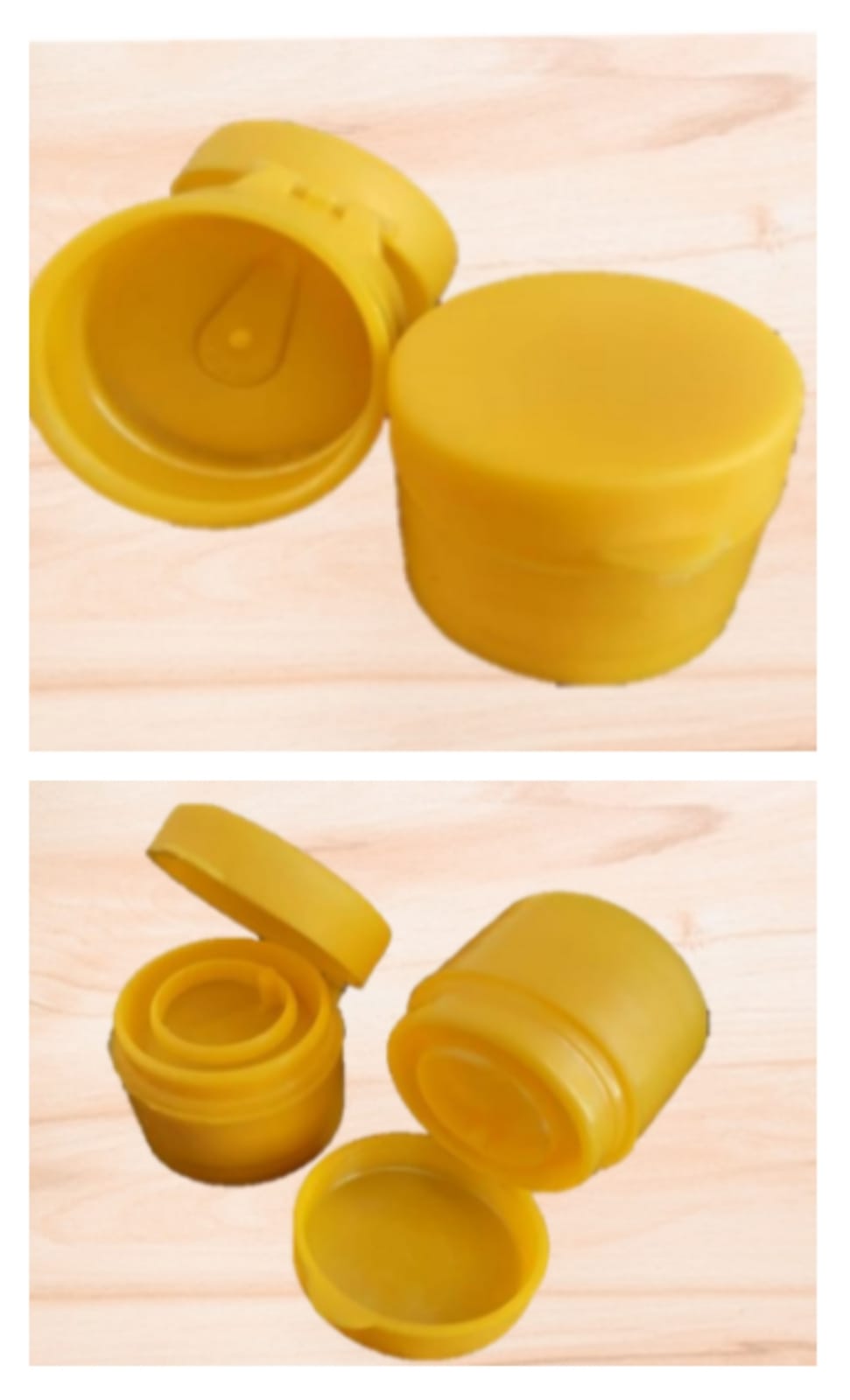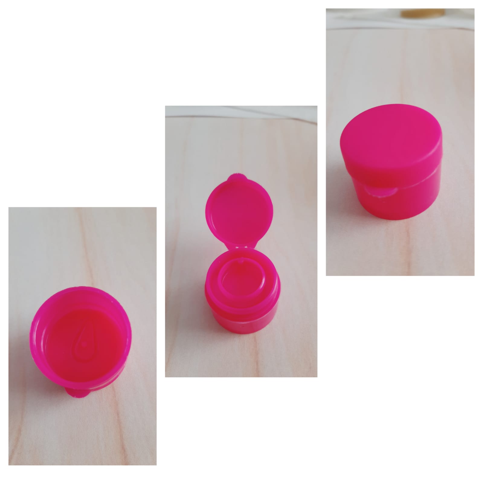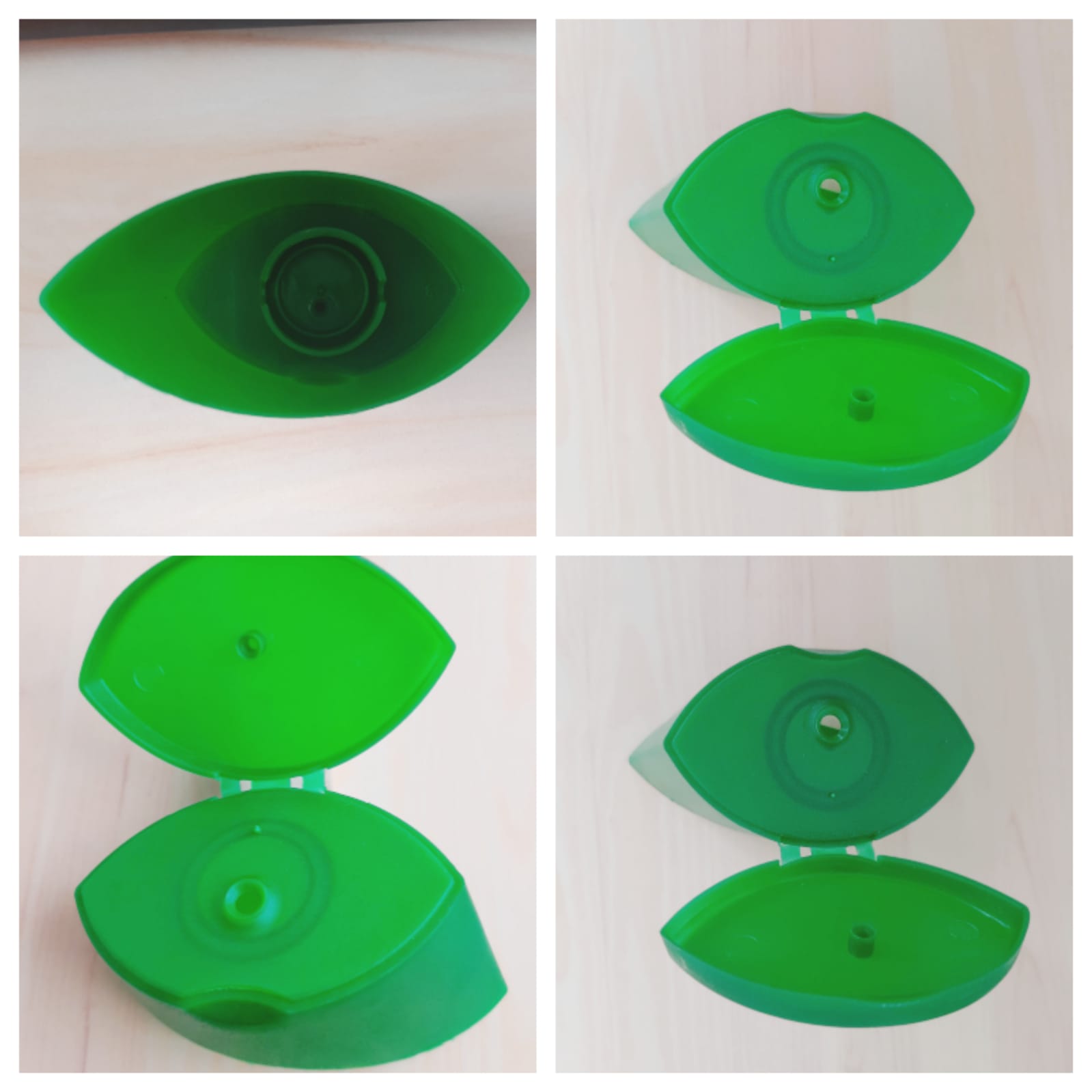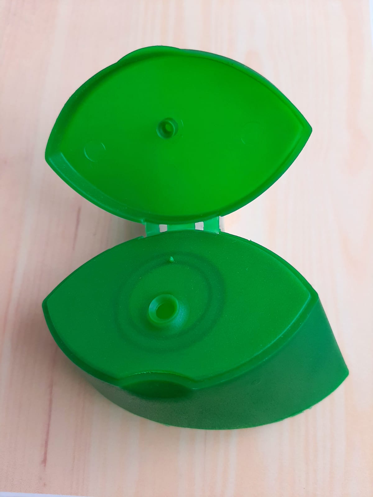 Es un tapón de una pieza con un cuerpo y una tapa conectada por una bisagra. la bisagra permite que la tapa se cierre con el cuerpo del tapón, que normalmente cuenta con una clase de hueco con el dedo.