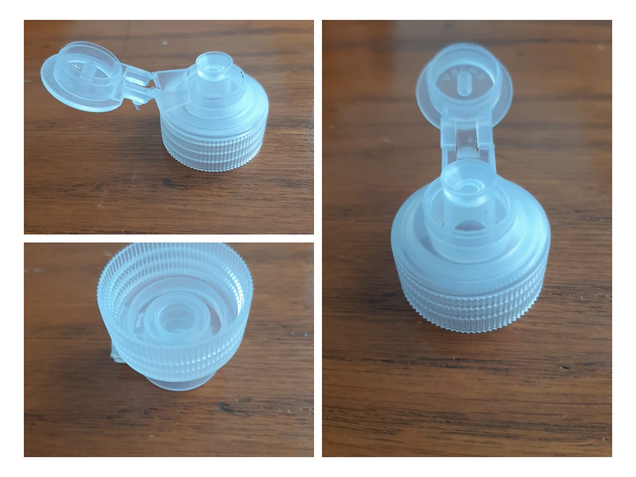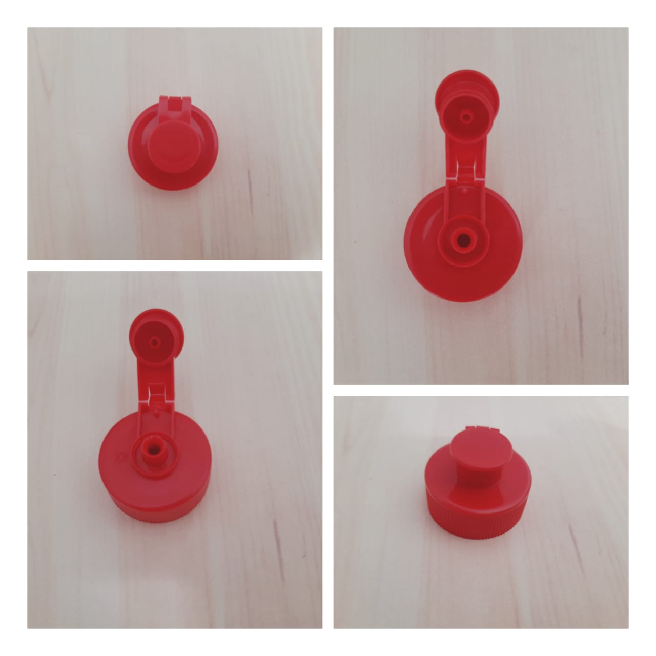 Es un tapón de una pieza con un cuerpo y una tapa conectada por una bisagra. la bisagra permite que la tapa se cierre con el cuerpo del tapón, que normalmente cuenta con una clase de hueco con el dedo.
